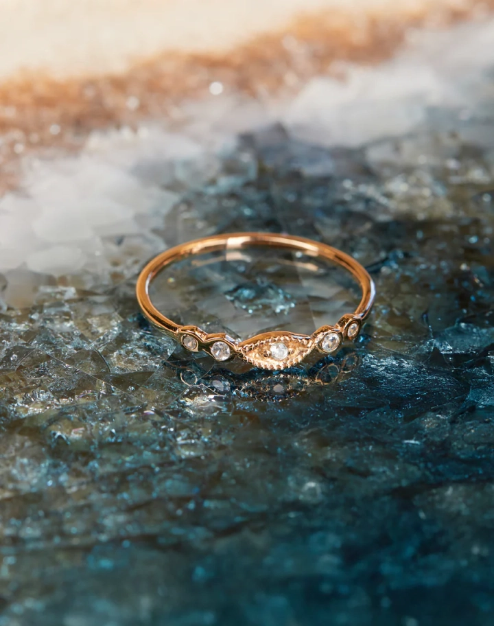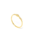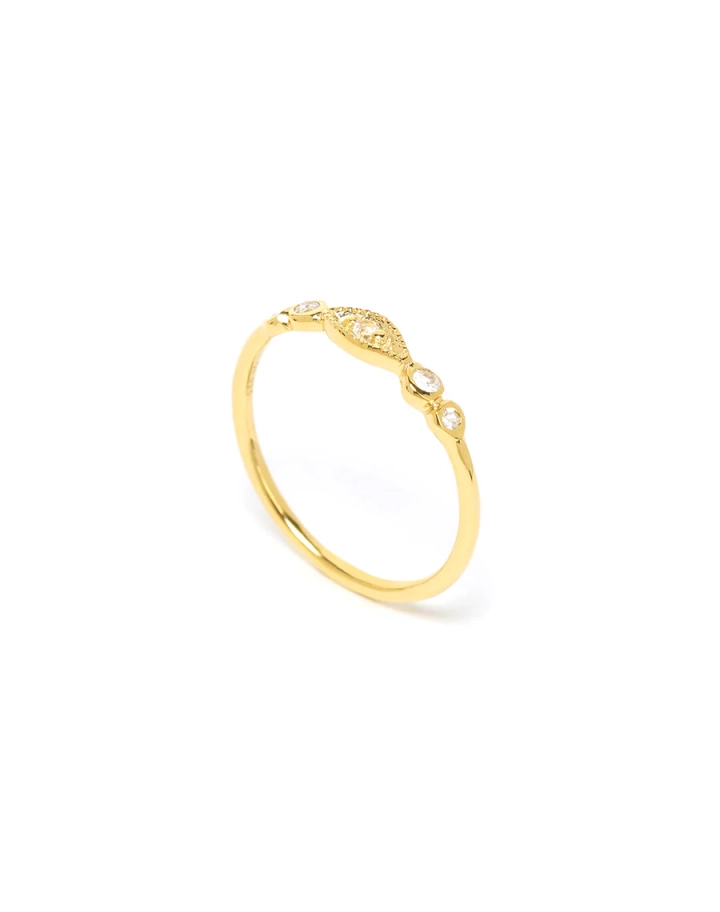 Fine et lumineuse, cette bague en vermeil (argent massif plaqué or) est sertie de zircons blancs disposés en ligne délicate.