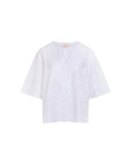 Son tissu en broderie ajourée illustrant des palmiers apporte une touche graphique et aérienne, laissant la peau respirer et créant un esprit vacances chic. La blouse se structure grâce à un col mao élégant et un ourlet de 5 cm qui assure une finition impeccable. Les manches larges peuvent se porter avec un revers pour un look plus décontracté ou descendues pour plus de sophistication. Sa coupe légèrement évasée permet un mouvement naturel tout en sublimant la silhouette.