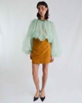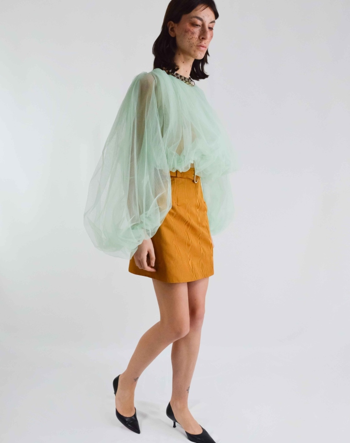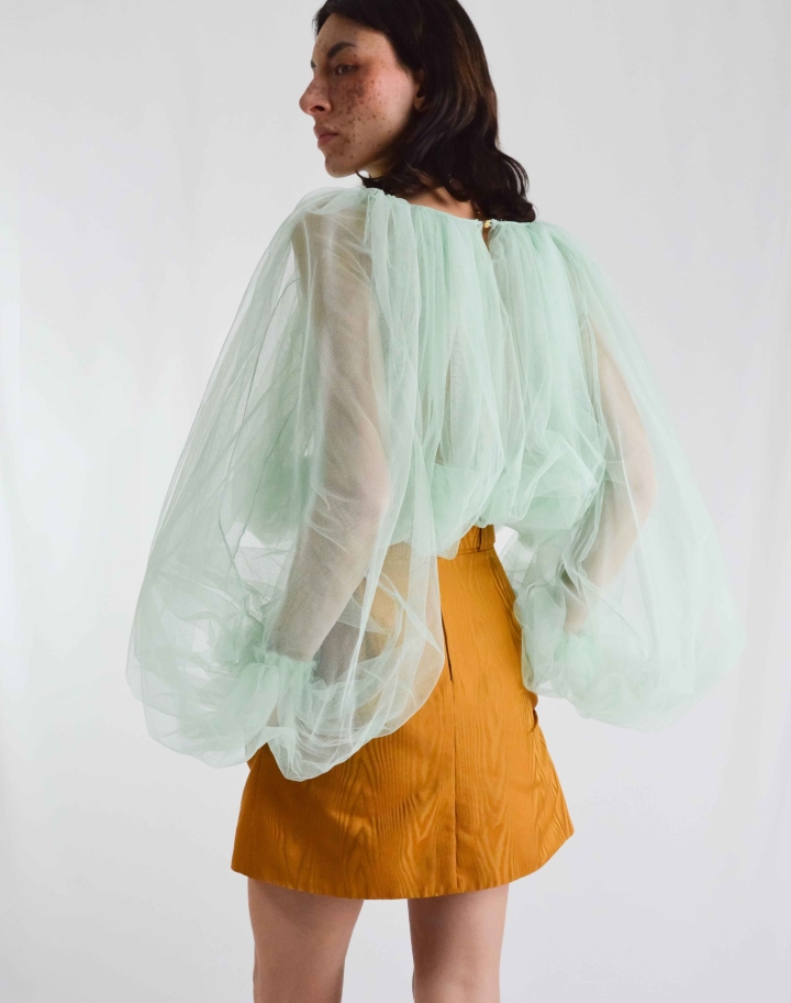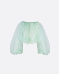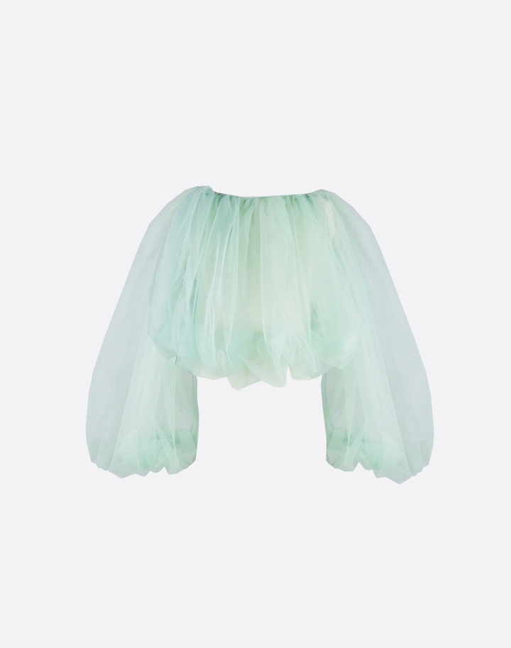 Blouse bouffante transparente en tulle colori aqua. Encolure bateau, manches longues bouffantes. Longueur taille.