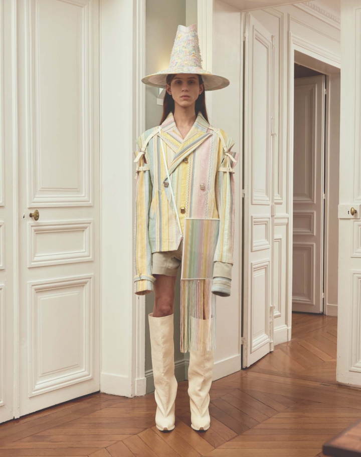 Confectionné dans un mélange unique de fils 100% coton, d’un tissu 100% coton et de soie. Sangle en cuir. Doublure 100% soie.