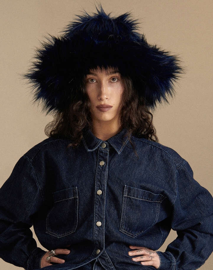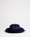 Bob en fausse fourrure bleu nuit à poils longs, doublé de motif carreaux en coton.