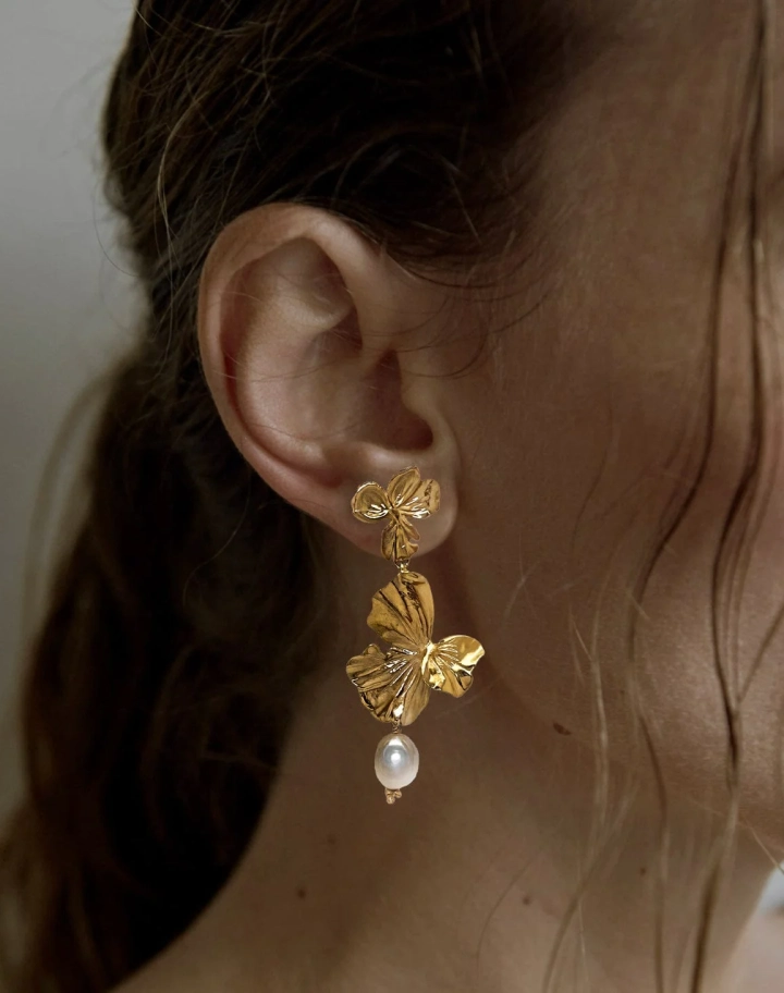 Sculptées à la main en laiton martelé, elles associent deux fleurs stylisées en un mouvement torsadé, rehaussé d’une perle naturelle en suspension.