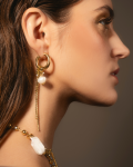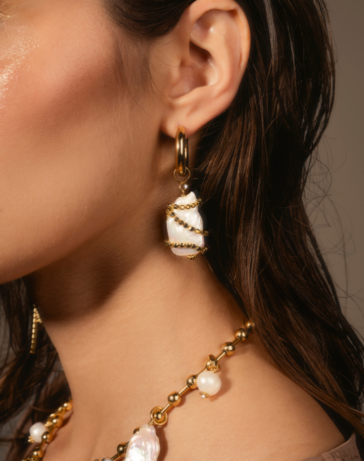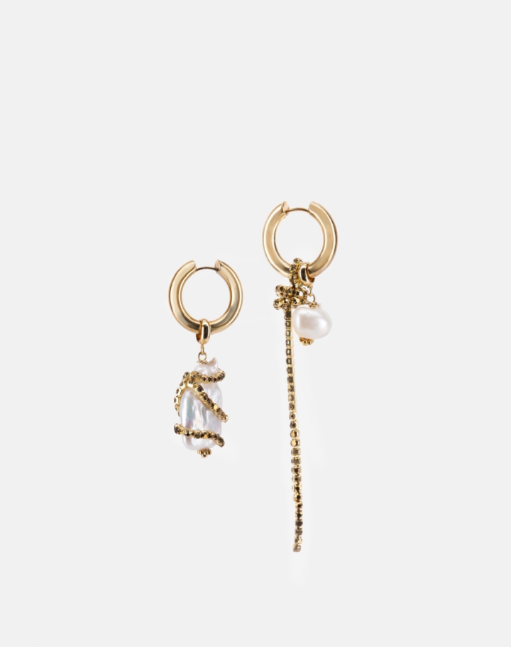 Boucles d'oreilles asymétriques avec des perles naturelles irrégulières ornées de délicates chaines de cristaux dorés mat.