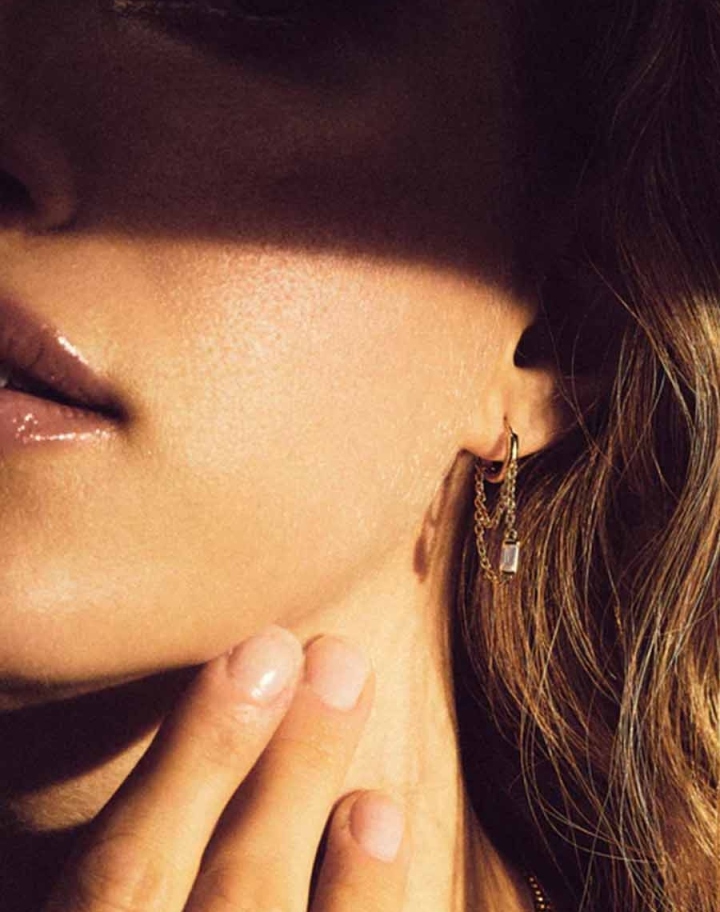 Créole unique, sublimée d’une chaînette en Vermeil (argent massif 925 % plaqué or 750 millièmes) et d’une Topaze taillée baguette.