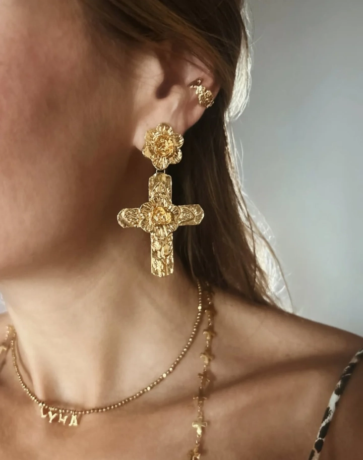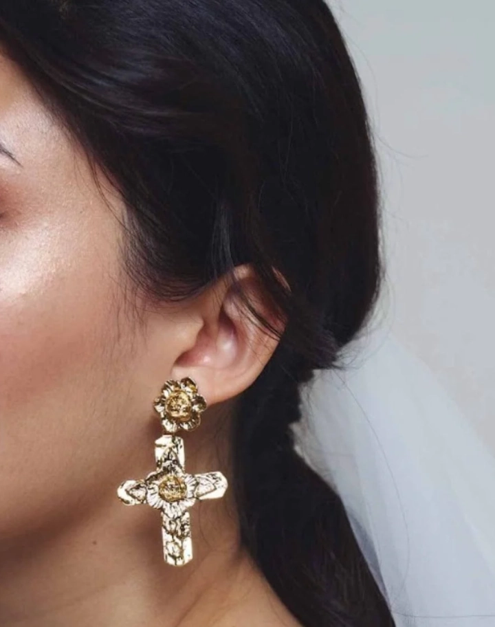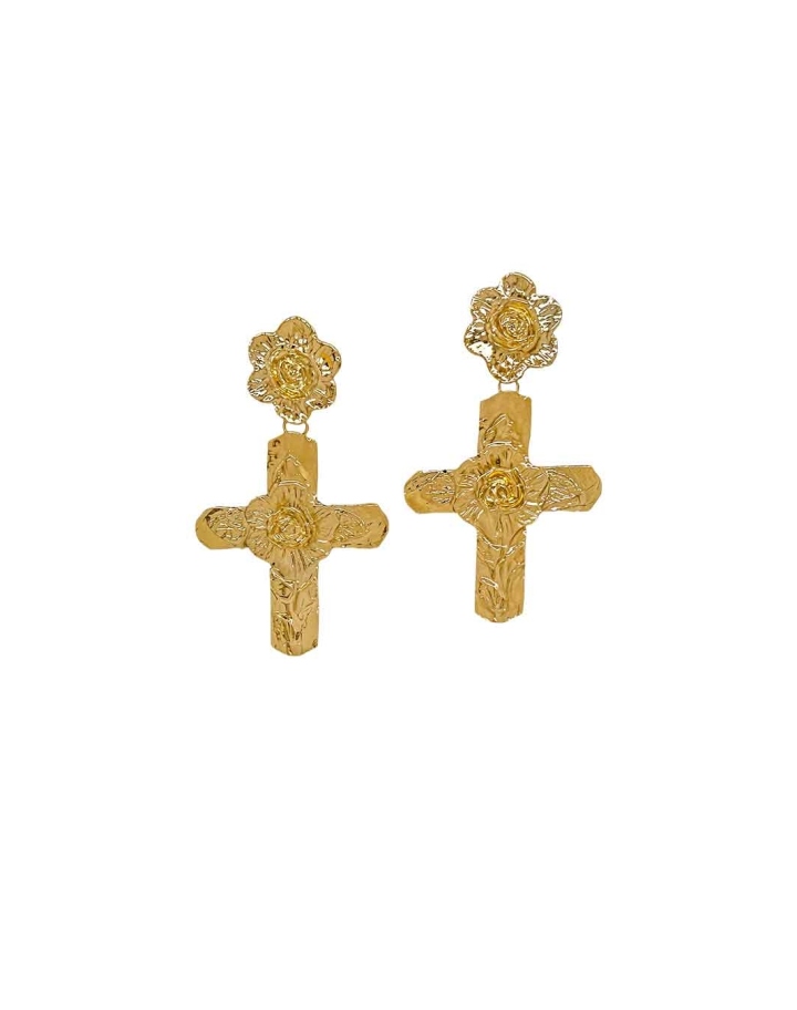 Les boucles d’oreilles pendantes Sian, sculptées à la cire et réalisées à la main dans notre atelier parisien, marient poésie et puissance. Ornées de fleurs délicates posées sur une croix, elles se distinguent par leur