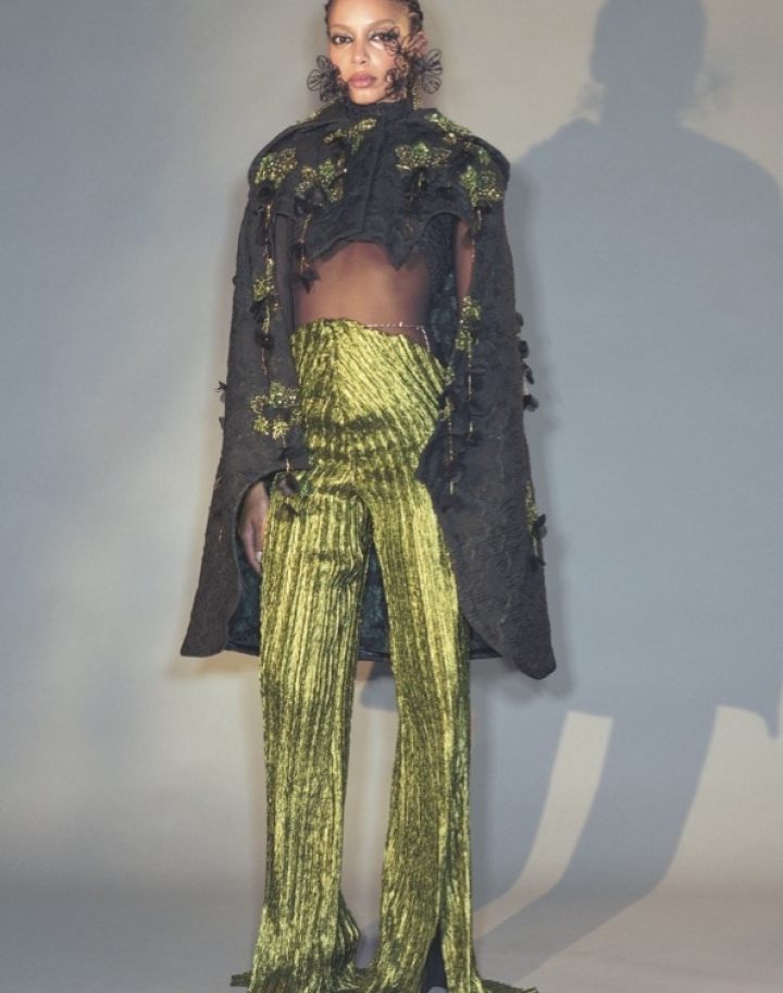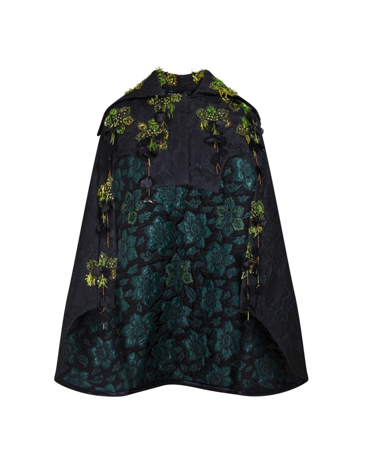 Cape en jacquard rebrodée par la maison d’art Lesage, les motifs floraux du tissus sont rebrodés dans l’idée de symboliser un écosystème, chaque pétales est brodée avec des techniques différentes afin de symboliser la diversité de la nature, il y a un assemblage de 15 teintes de fils et de perles différentes afin de rappeler les couleurs et reflets du pantalon qui compose la tenue présentée.