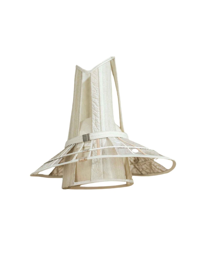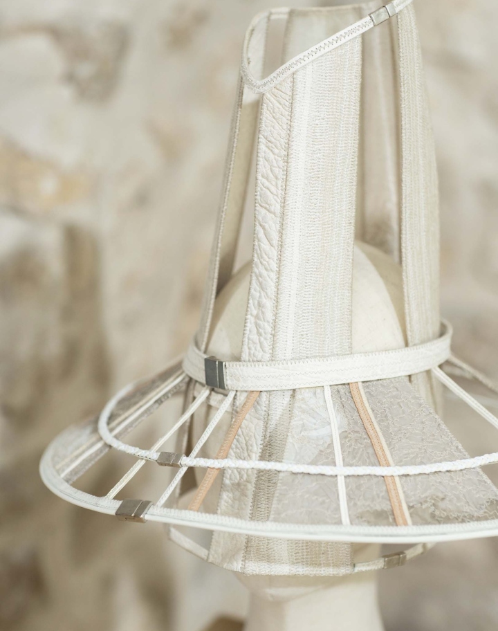 Pièce artisanale – Chapeau réalisé en mélange de cuir, fils 100 % coton et organza 100 % soie.