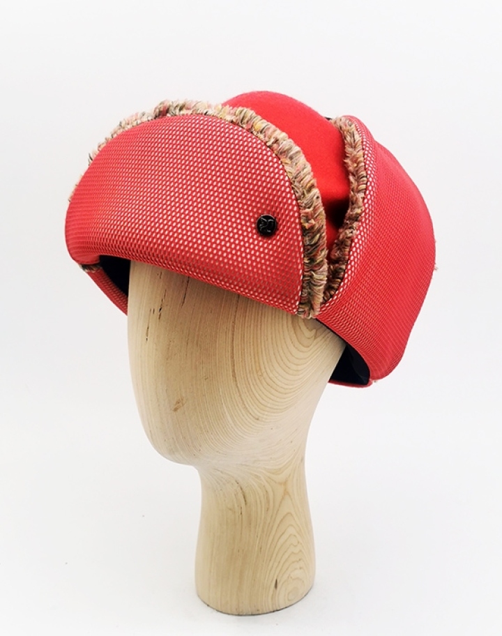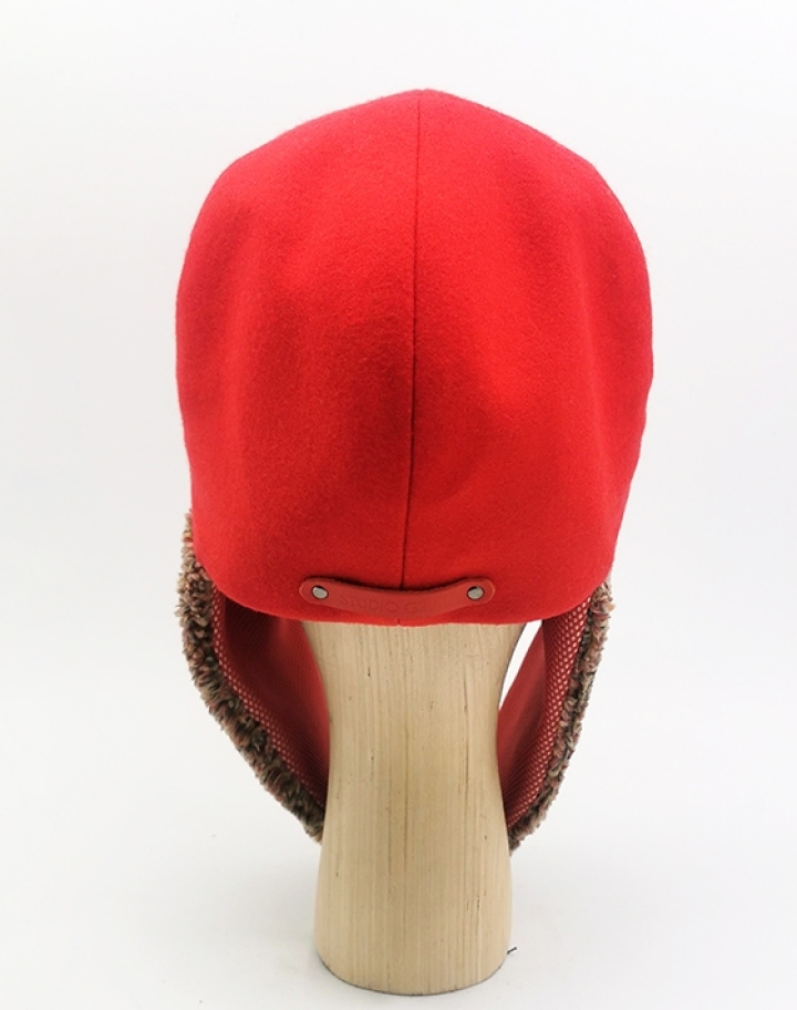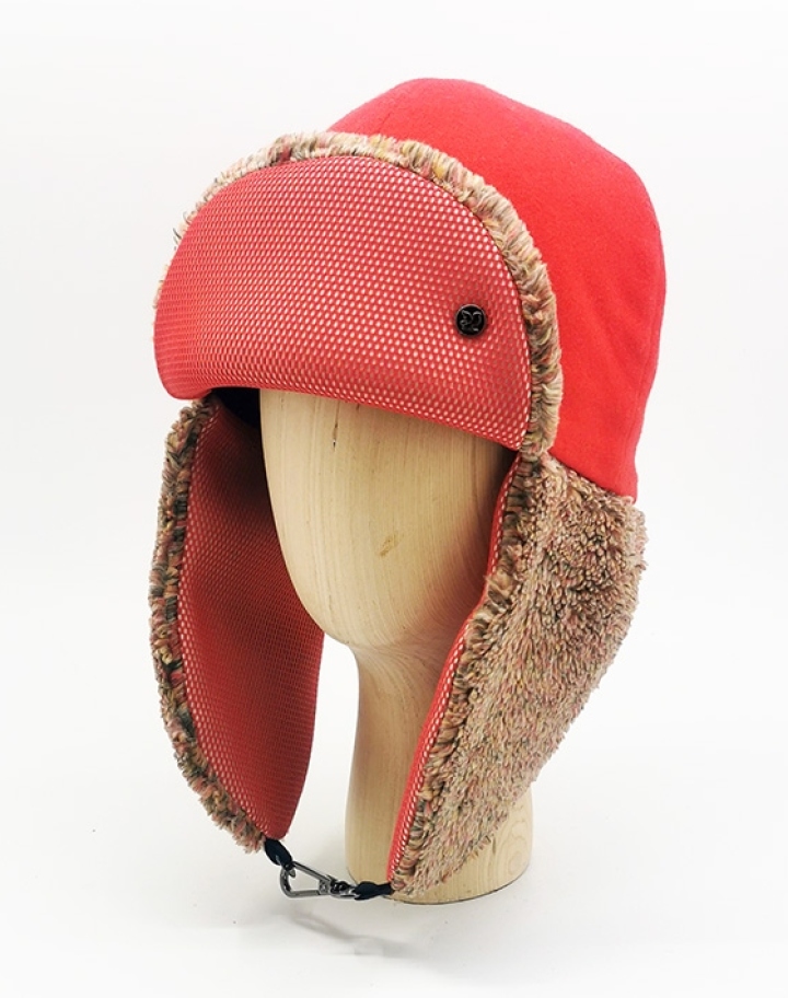 Avec son drap de laine rouge profond, la KIRA affirme sa présence. Les revers et cache-oreilles en tissu technique reprennent les codes du sport-luxe, tandis que la fausse fourrure beige rosée à l’intérieur apporte douceur et modernité.