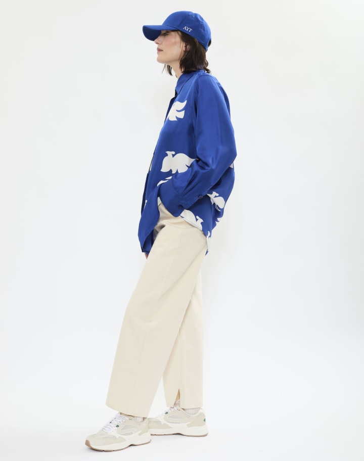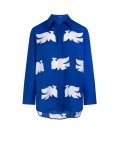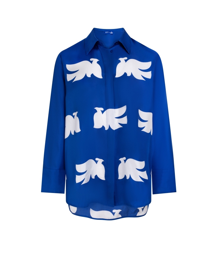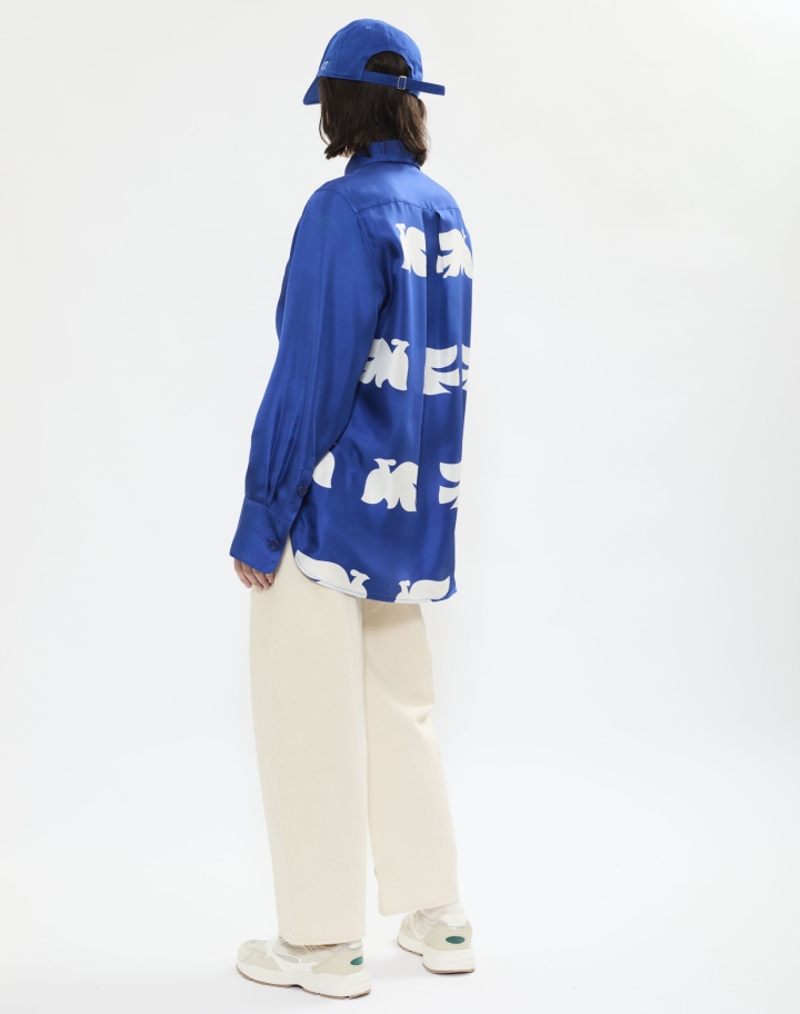 Chemise en soie empruntée au vestiaire masculine, ornée d’un imprimé exclusif inspiré de l’œuvre 'Bel Envol' de l’artiste REMED.