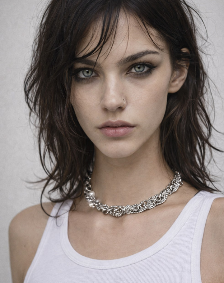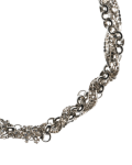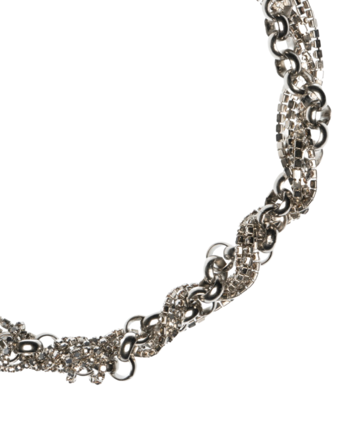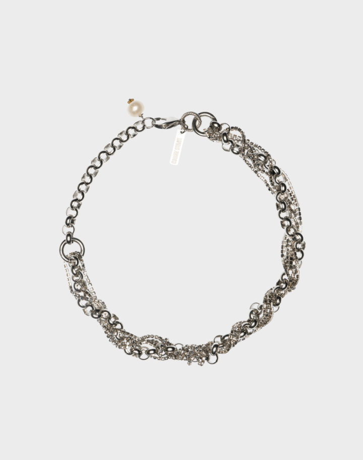 Collier au volume souple épouse naturellement la base du cou, est composé d'une chaine à maille épaisse en plaquée argent délicatement entrelacée dans un ensemble de chaines fines et délicates en cristaux argenté mat. Longueur ajustable jusqu’à 45cm.