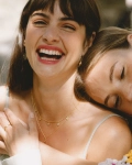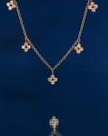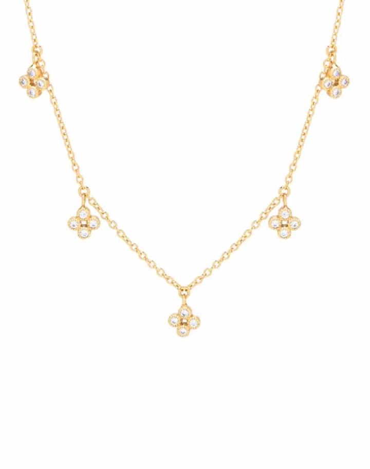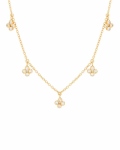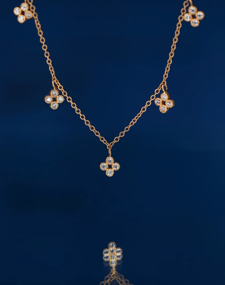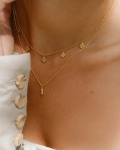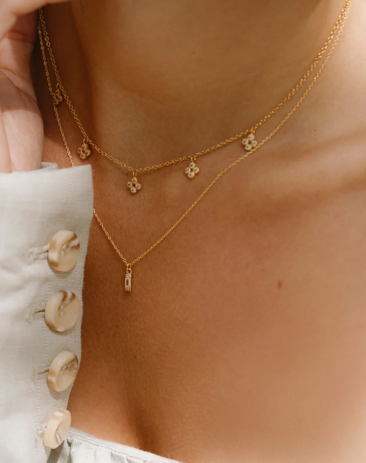 5 minis pendentifs travaillés à la main et sertis de zircons naturels ont été répartis le long d’une maille en plaqué or 750 millièmes.