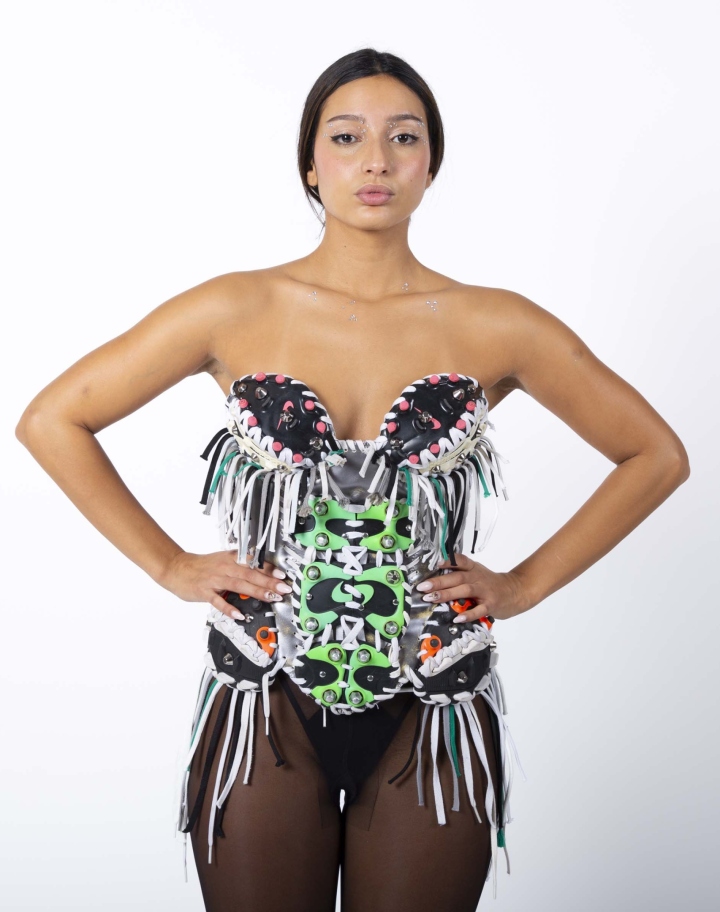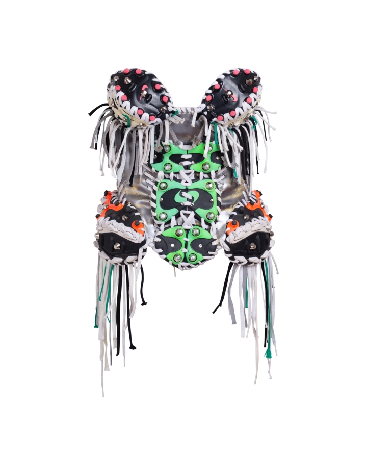 Né pour détourner la matière, METATYPE façonne des artefacts hybrides, mi-armure mi-sculpture, issus des entrailles d’un centre de tri bordelais. Héritier de Mugler, Margiela et des univers post-apocalyptiques, Alix Caumont, finaliste du Festival de Hyères 2025 et lauréat du Triathlon de la Mode Éthique 2024, transforme l’ancien et le jetable en précieux, questionnant ainsi la surproduction de notre société. Tissus, cuirs, mais aussi chaussures de sport et crampons issus du réemploi sont revalorisés pour créer des pièces uniques et inattendues, comme venues d’un futur où rien ne se perd et tout se métamorphose. Entre artisanat, expérimentation et engagement, METATYPE élève la revalorisation textile au rang d’art. Voici les pièces qu'Alix nous a confiées ! Photo @hyperactif_lab