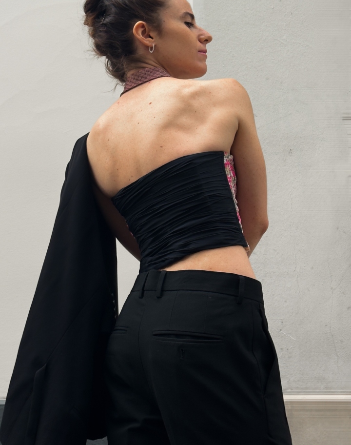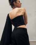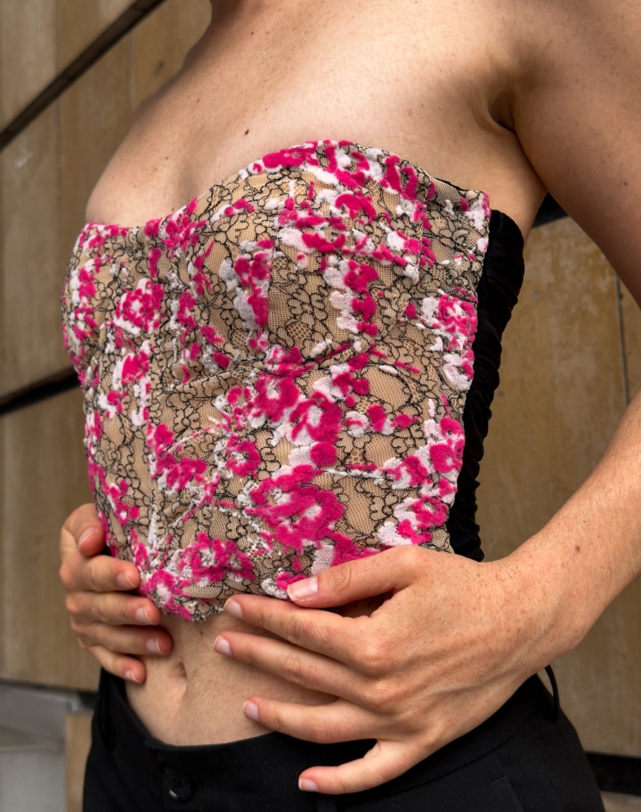 Un corset à la fois sensuel et audacieux, qui joue avec les textures d’une dentelle en relief. Le dos drapé de mousseline apporte légèreté et mouvement, transformant le buste en un mélange vibrant de sensualité et de vivacité. Une pièce qui capte le regard tout en révélant subtilement la silhouette.