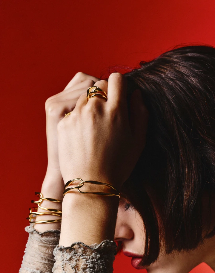 Notre bracelet jonc Unchained – N°1 est composé d’un entrelacement organique et fusionnel pour former un jonc aux courbes ondulées.