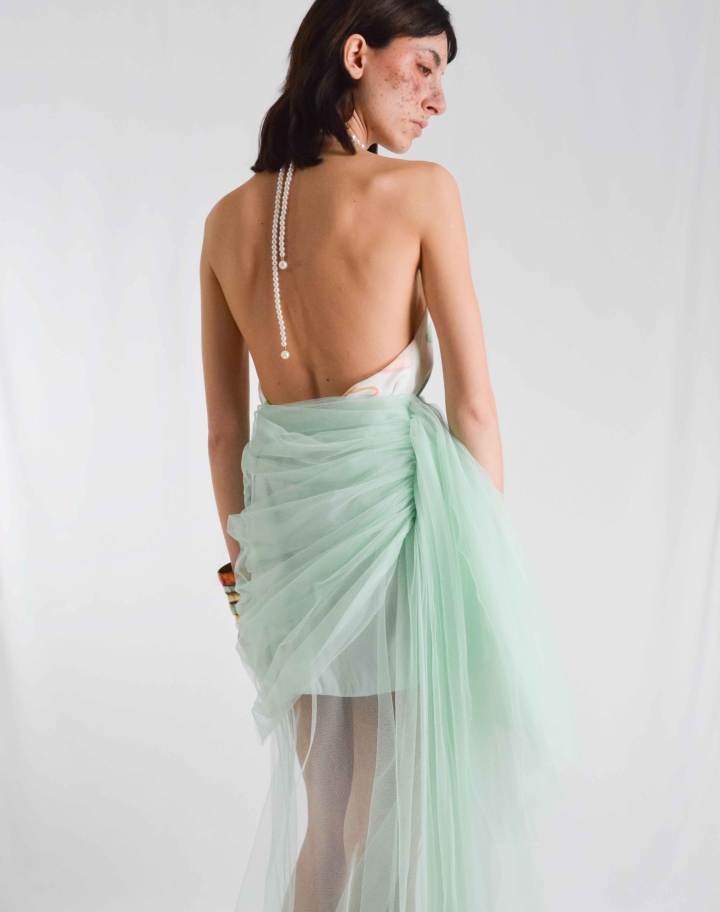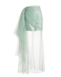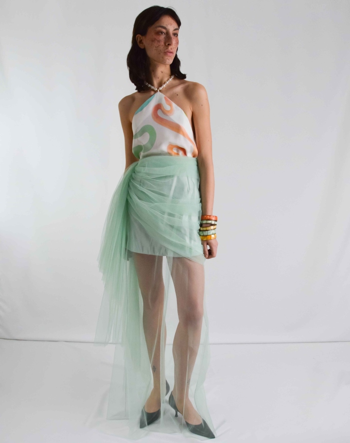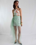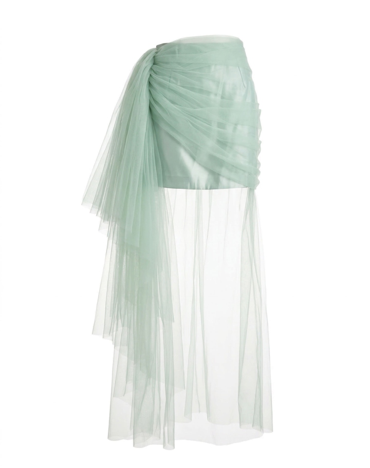 Jupe asymétrique en tulle coloris Aqua, avec un drapé sur le côté, doublée d’une mini-jupe en satin. La matière transparente laisse apercevoir les jambes