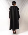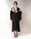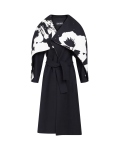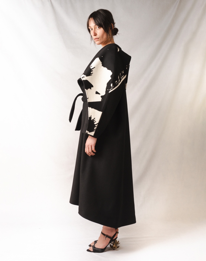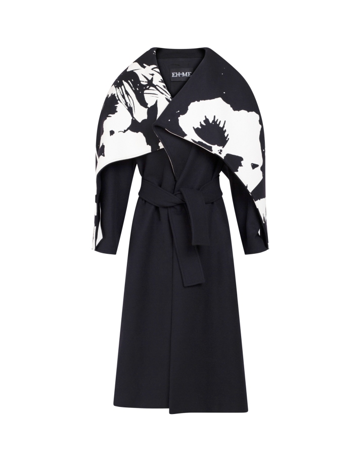 Manteau large en laine et cachemire avec motifs floraux sur le rabat.