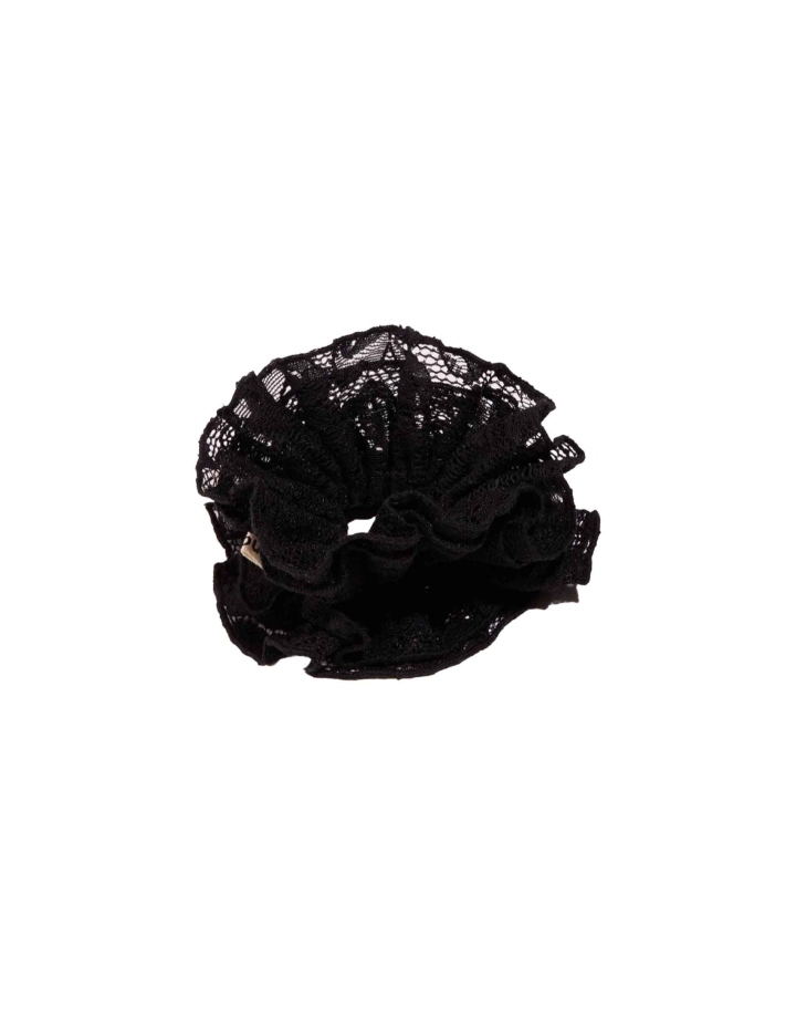 Maxi chouchou en dentelle noire et contour noir, fabriqué en France à la main, à partir d’un magnifique tissu upcyclé.
