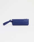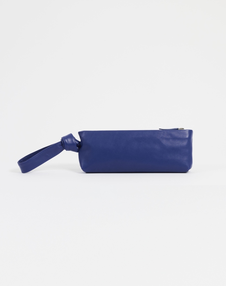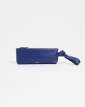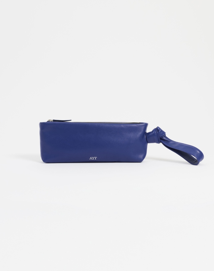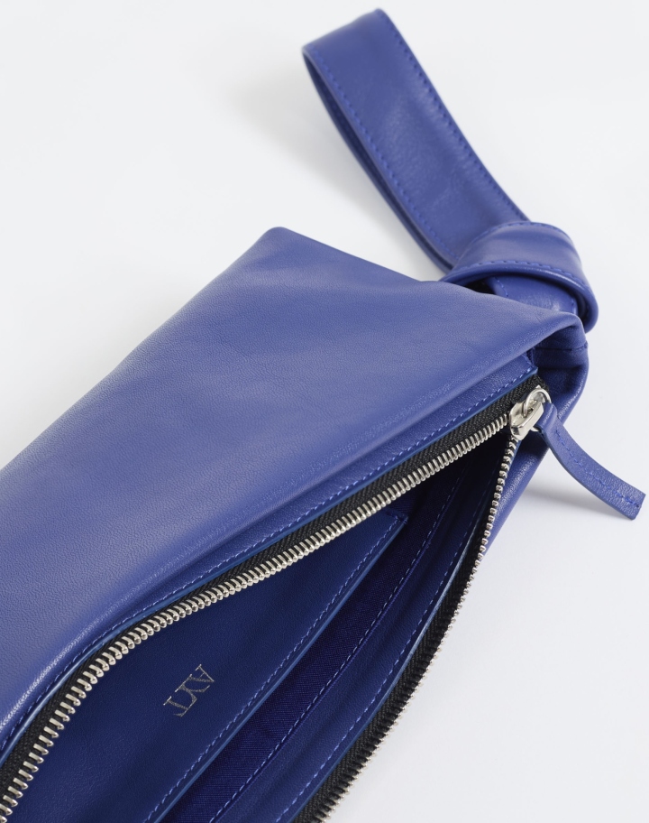 Élégante pochette en cuir bleu souple, dotée d’une dragonne nouée inspirée du foulard, à porter au poignet.Pensée pour une silhouette contemporaine, elle allie raffinement et praticité au quotidien. Une fois zippée, elle est parfaitement dimensionnée pour accueillir un téléphone.
