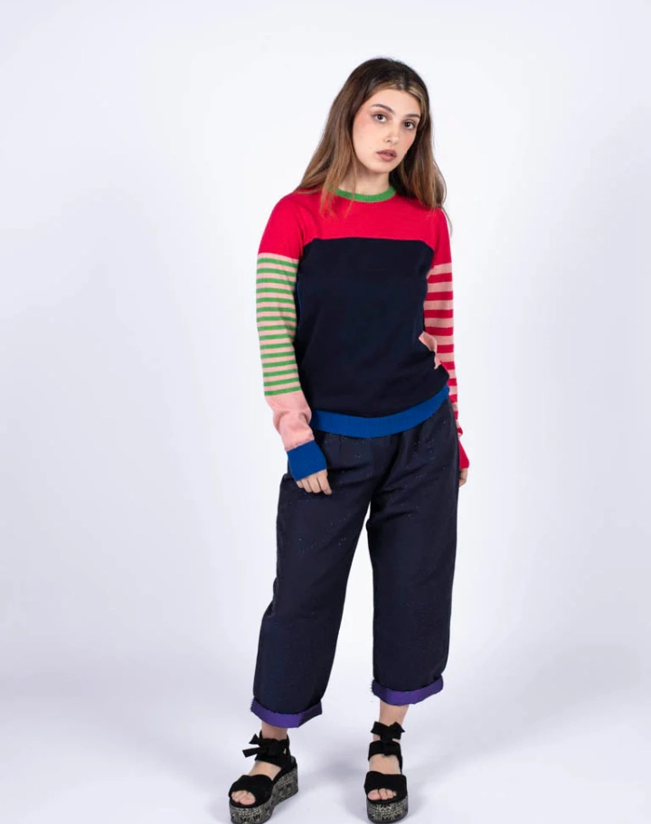 - Marinière colorée : bleu marine pailleté, rose éclatant, vert menthe et rose clair