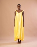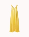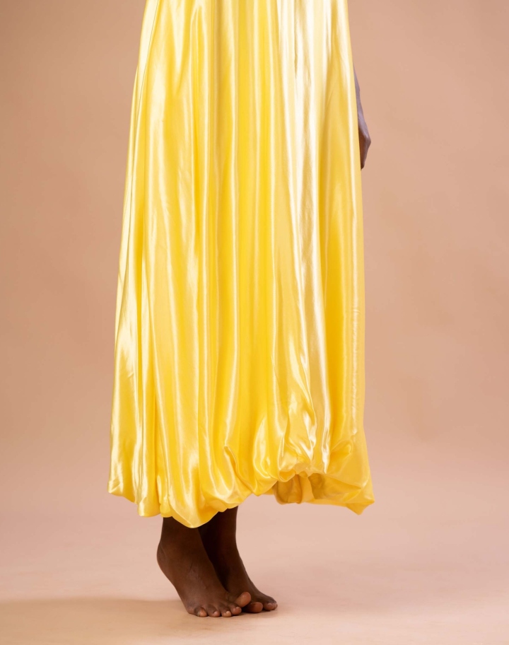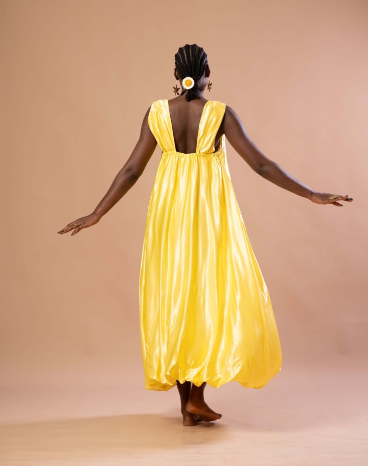 La robe JÀNT, du mot wolof signifiant soleil, célèbre la lumière. Sa coupe ballon fluide, ses nœuds imparfaits sur les épaules et ses poches discrètes composent une silhouette libre et radieuse.