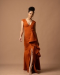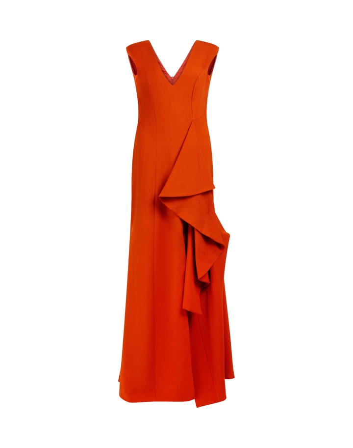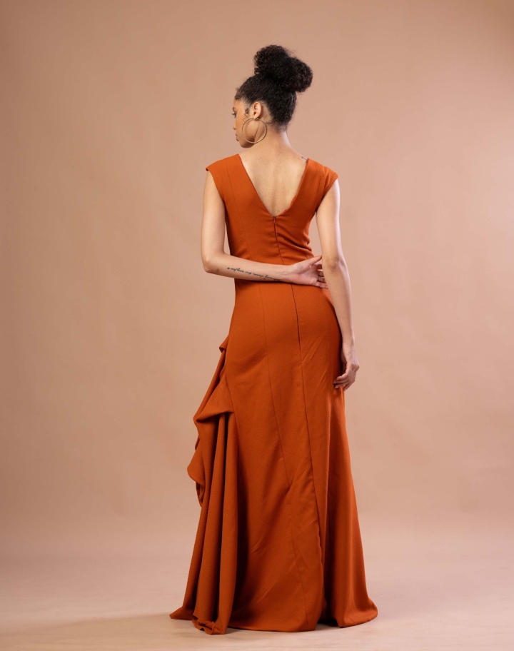 La KERMEL, robe longue en tweed rouille, épouse le corps avec précision avant de se déployer en un drapé architectural sur la hanche. Sa fente subtile allonge la silhouette et révèle une sensualité maîtrisée.