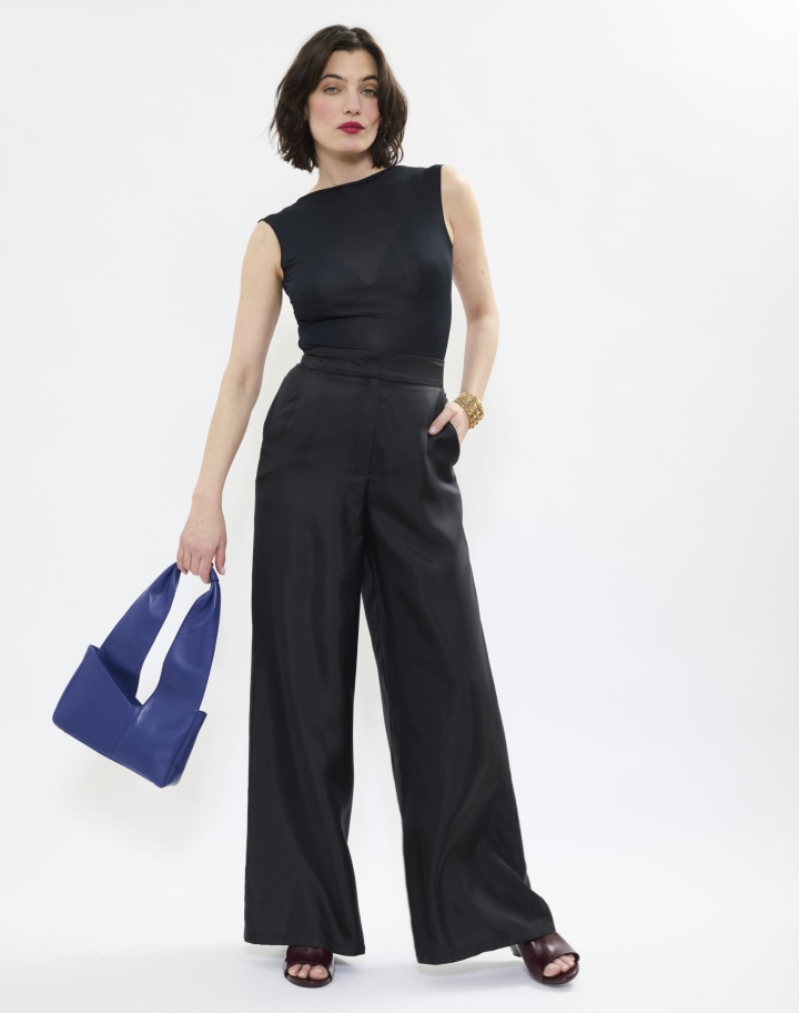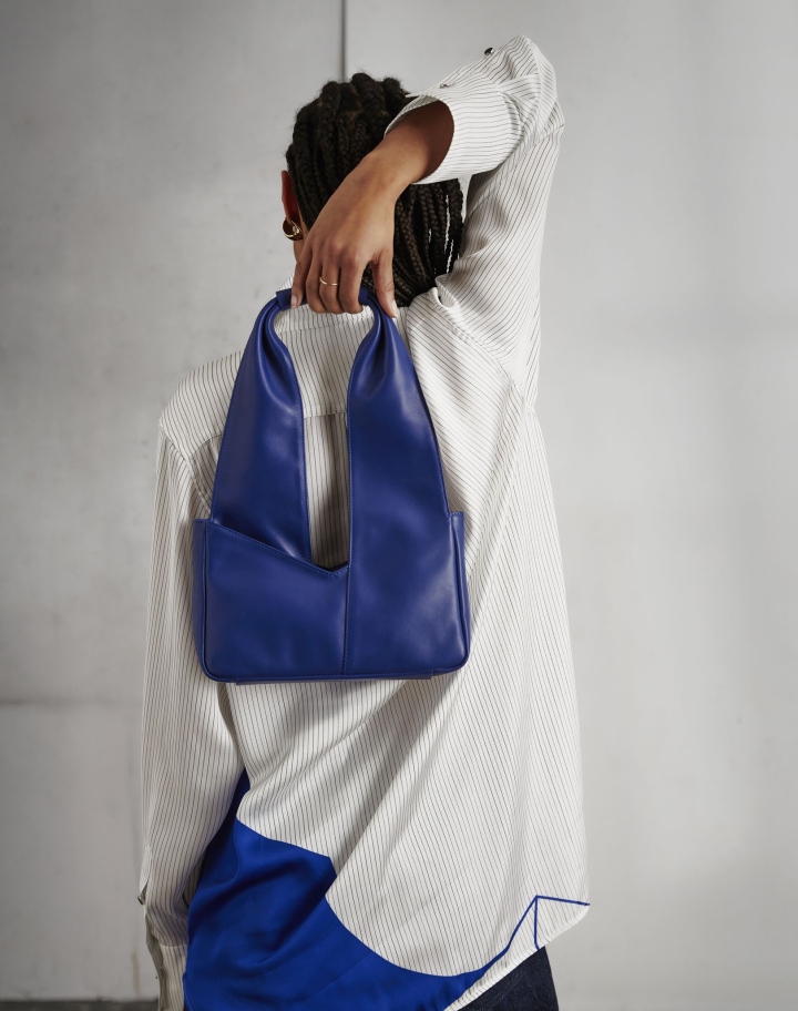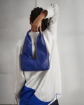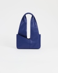 Petit sac porté épaule fabriqué à la main en cuir bleu lisse, avec une anse inspirée du foulard. Sa silhouette fluide et son toucher doux en font un modèle idéal du matin au soir.