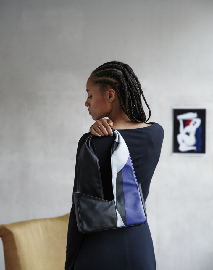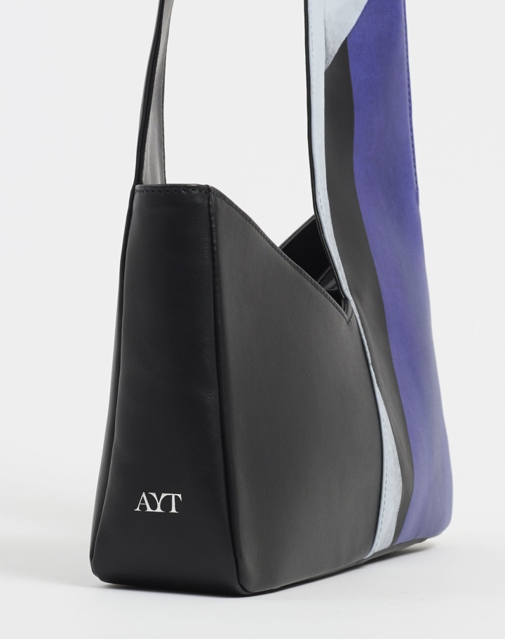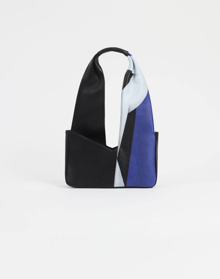 Petit sac porté épaule en cuir imprimé doté d'une anse inspiré du foulard. Versatile, il présente de manière audacieuse un côté imprimé inspiré de l’œuvre ‘Tempérance’ de l’artiste Remed et de l'autre, son aspect uni noir offre une silhouette sobre et raffinée.
