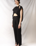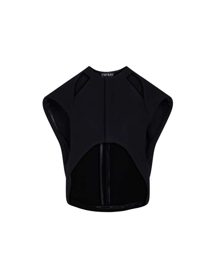 Veste courte coupe arrondie avec plis dos, sans manche. Cette veste est pensée comme une carapace qui protège et donne de la force à la silhouette.