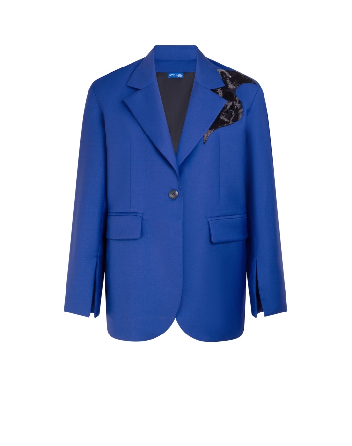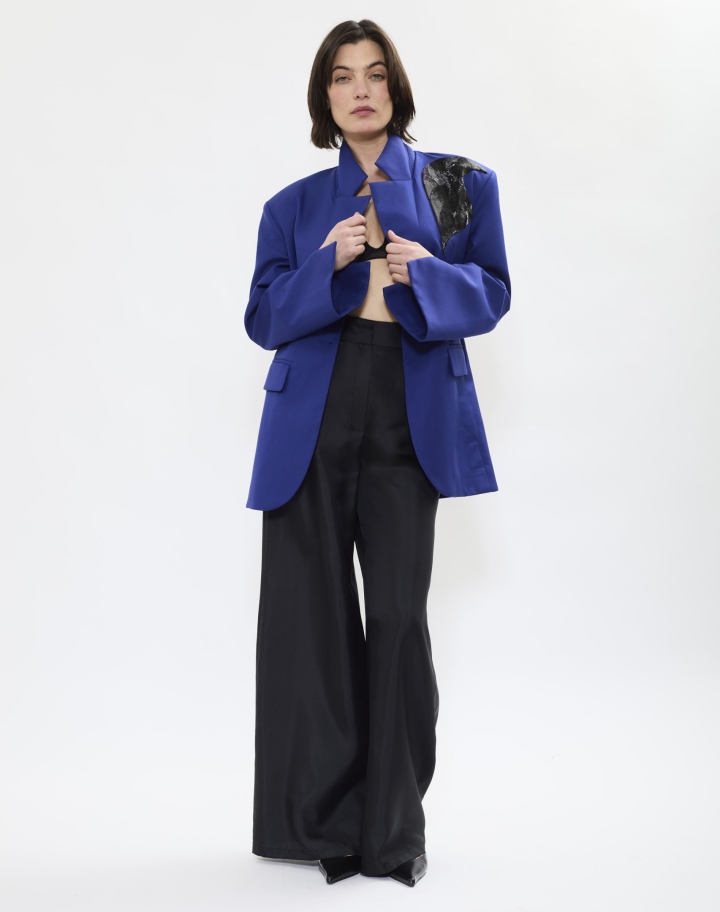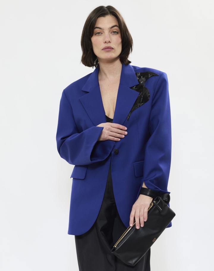 Un blazer qui conjugue élégance sculpturale et raffinement contemporain, réinterprétant un essentiel intemporel à travers une silhouette oversize audacieuse, d’un bleu profond.